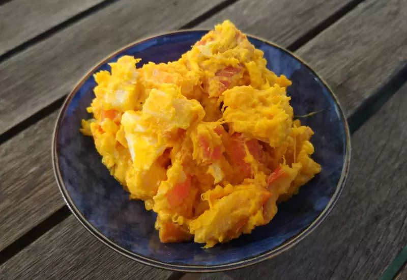 Kostičky hůře drží tvar, konzistence je spíše kašovitá. Výrazná dýňová chuť hraje prim nad ostatními surovinami. Pokud máte rádi dýni a salát preferujete výrazný, je velmi dobrá. Pokud ale chcete jen nahradit brambory v klasické verzi salátu, není to nejlepší volba. Dýni doporučujeme vařit nebo jako my napařovat. Vařte ji opatrně, aby nebyla příliš měkká a  v salátu si zachovala tvar.