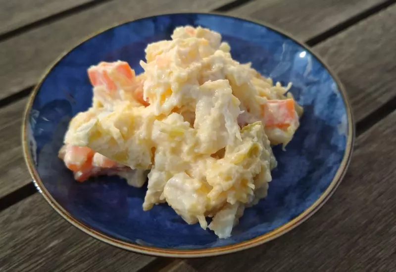 Kostičky hezky drží tvar. Textura je více chrupavá a není tolik vodnatá jako u tuřínu. První den je v salátu lehce nasládlá, po zaležení se ale nasládlost ztrácí a cítíme lehký brukvovitý dozvuk. Ten ale nezakrývá chuť ostatních surovin. Kedlubnu považujeme za rozumnou náhradu brambor.